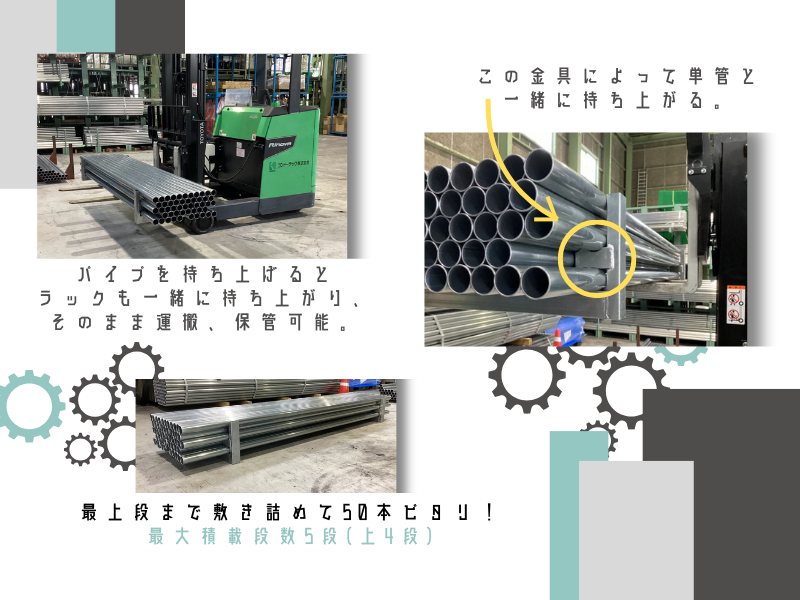 パイプを持ち上げるとラックも一緒に持ち上がり、そのまま運搬、保管可能。